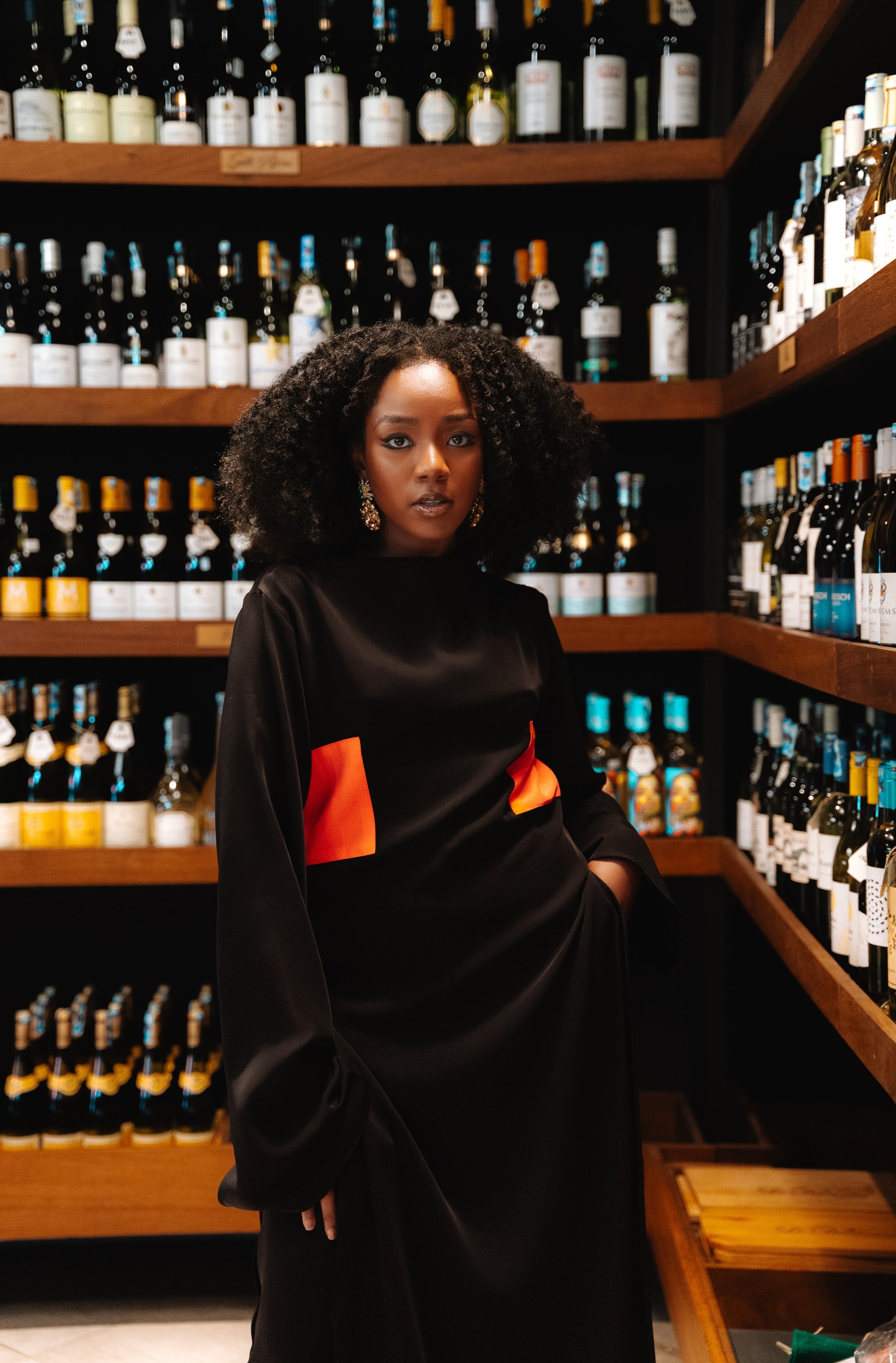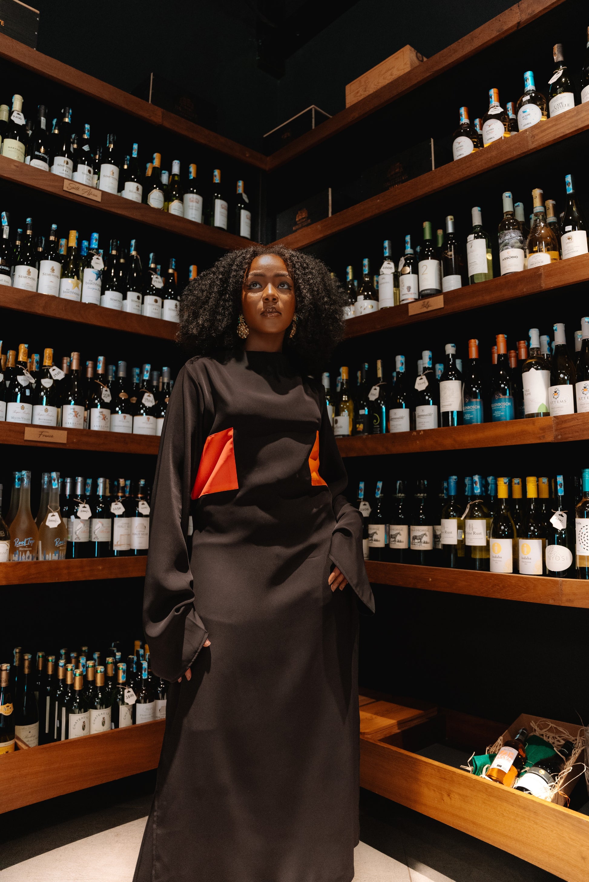 Inspired by a popular Indian garment, the 'Salwar Kameez', this black two piece represents a quiet elegance. Named after the Hindu goddess of strength, protection and fierceness, the Durga is designed to exude confidence and communicate ambition. Made of a substantial yet supple fabric, the top possesses two long side slits opening up to matching straight pants. The orange pops of colour tease the eyes but in a respectful and modest manner. Strut the Durga into dinner or the boardroom; your choice.
